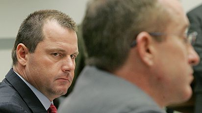 Clemens 在國會聽證會上瞪著揭發他的前私人訓練員